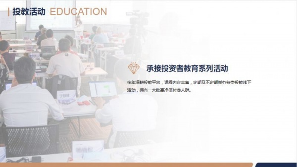 多年深耕投教平臺,課程內容豐富,定期及不定期舉辦各類投教線下活動,擁有一大批高凈值付費人群。